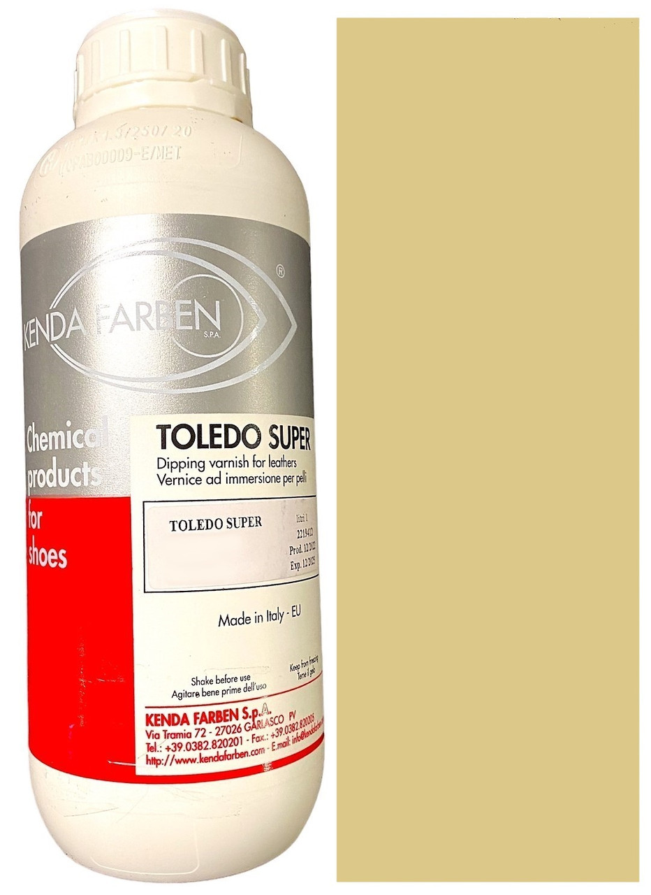TOLEDO SUPER – рідкий однокомпонентний барвник для шкіри рослинного та хромового дублення, шкіри змішаного дублення, а також дерев'яних та пробкових деталей устілок та підошов сандалі. Ефективно забарвлює шкіру, зберігаючи її натуральну м'якість.